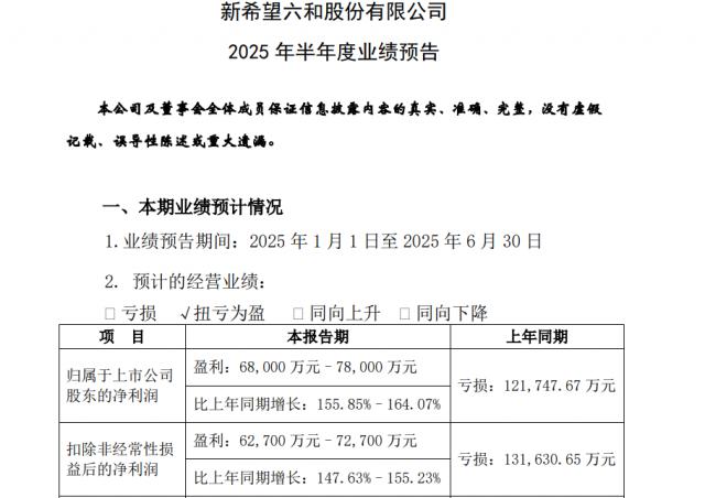 此外,新希望还披露了上半年的业绩预告。新希望预计今年上半年实现归母净利润 6.8 亿元至 7.8 亿元,同比扭亏,去年同期公司净亏损高达 12.17 亿元。