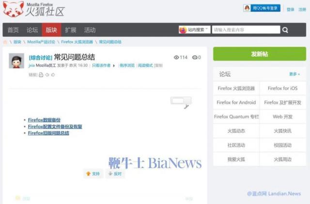 据蓝点网报道,对于火狐浏览器将退出中国市场,火狐浏览器员工已经在火狐社区发布常见问题总结,提供数据备份、配置文件备份及恢复、旧版问题总结等。