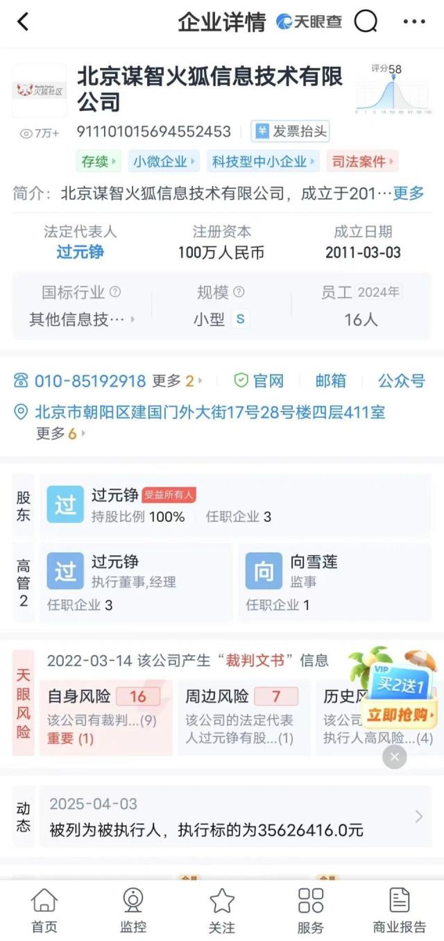 鞭牛士致电北京谋智火狐信息技术有限公司的电话发现,电话成功拨通并响铃,但无人接听。